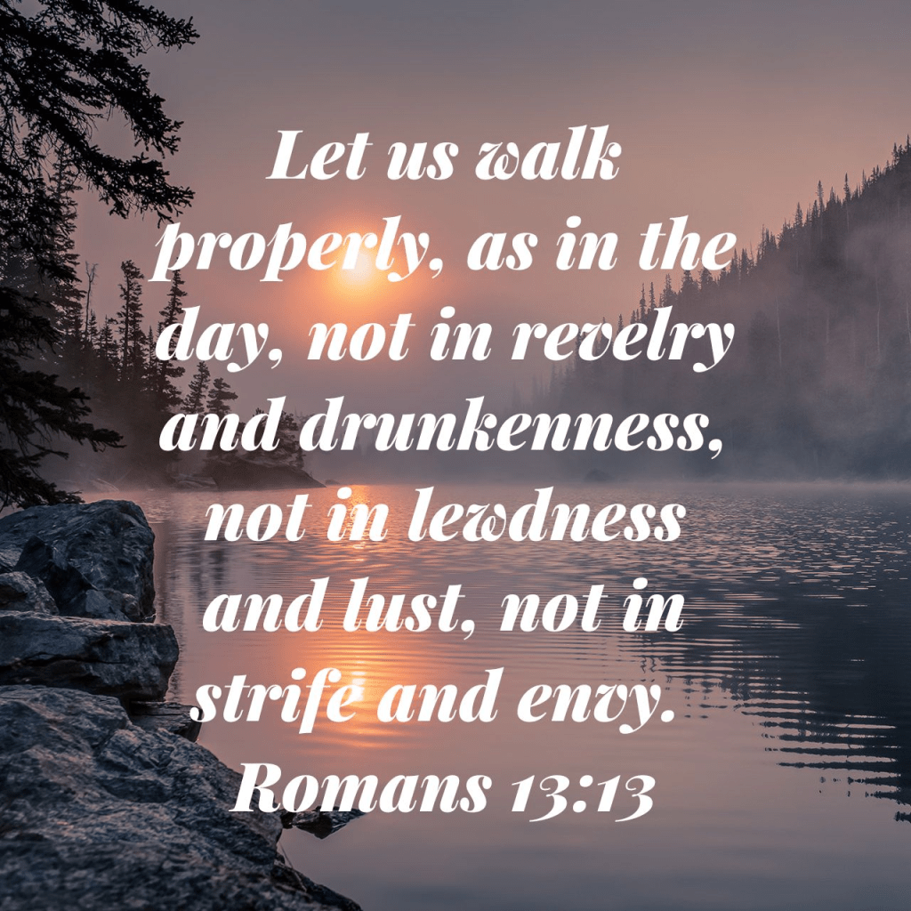 And do this, knowing the time, that now it is high time to awake out of sleep; for now our salvation is nearer than when we first believed. The night is far spent, the day is at hand. Therefore let us cast off the works of darkness, and let us put on the armor of light. Let us walk properly, as in the day, not in revelry and drunkenness, not in lewdness and lust, not in strife and envy. But put on the Lord Jesus Christ, and make no provision for the flesh, to fulfill its lusts.